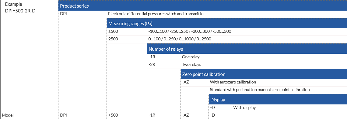 • für DPI-24-±500: ±50 Pa, ±100 Pa, ±150 Pa, ±250 Pa, ±300 Pa, ±500 Pa, 0…100 Pa, 0…250 Pa
